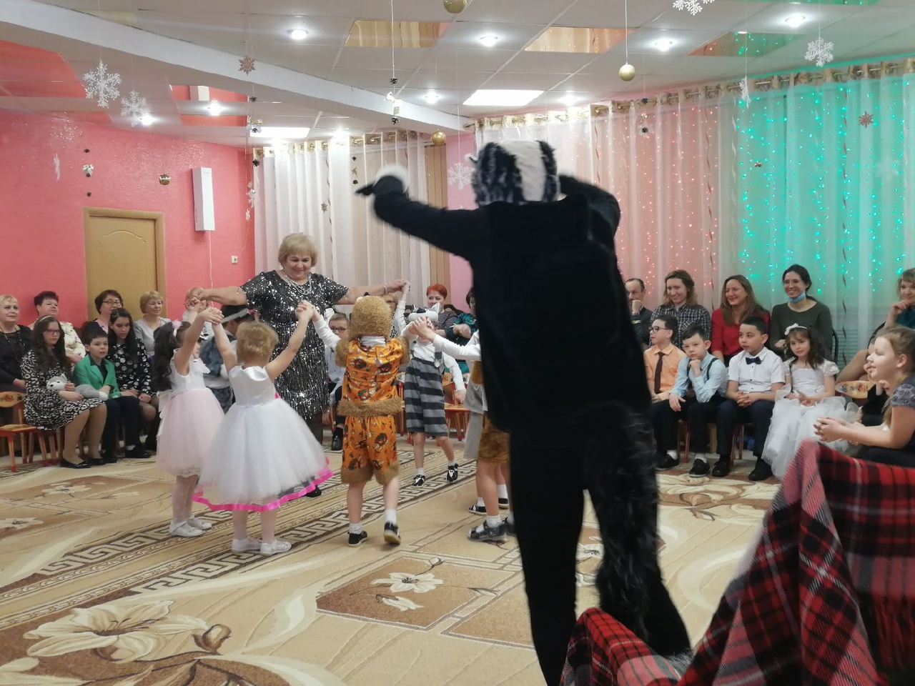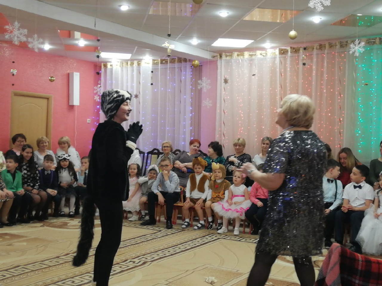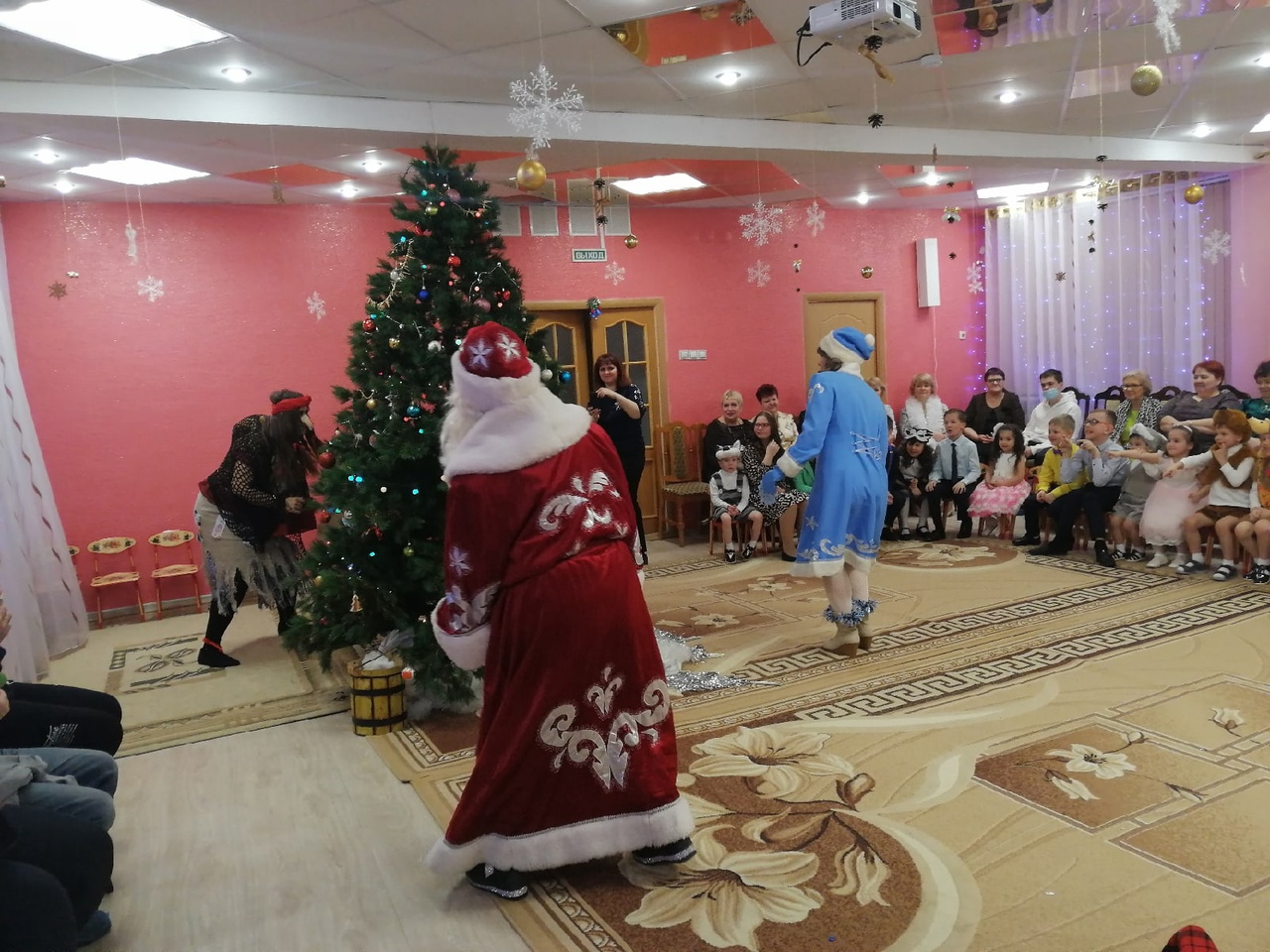 Наши воспитатели и специалисты, участвующие в новогоднем празднике, проявили себя хорошими артистами, показывая всё своё творческое мастерство, артистизм, задор и организаторские способности! Они перевоплотились в разных сказочных героев: в доброго Деда Мороза, в милую Снегурочку, в хитрую Бабу Ягу, Лешего и кота.
