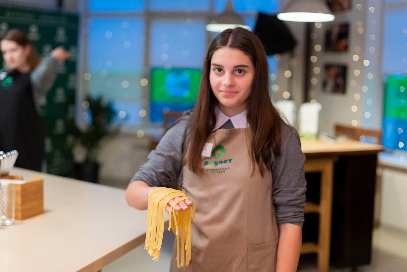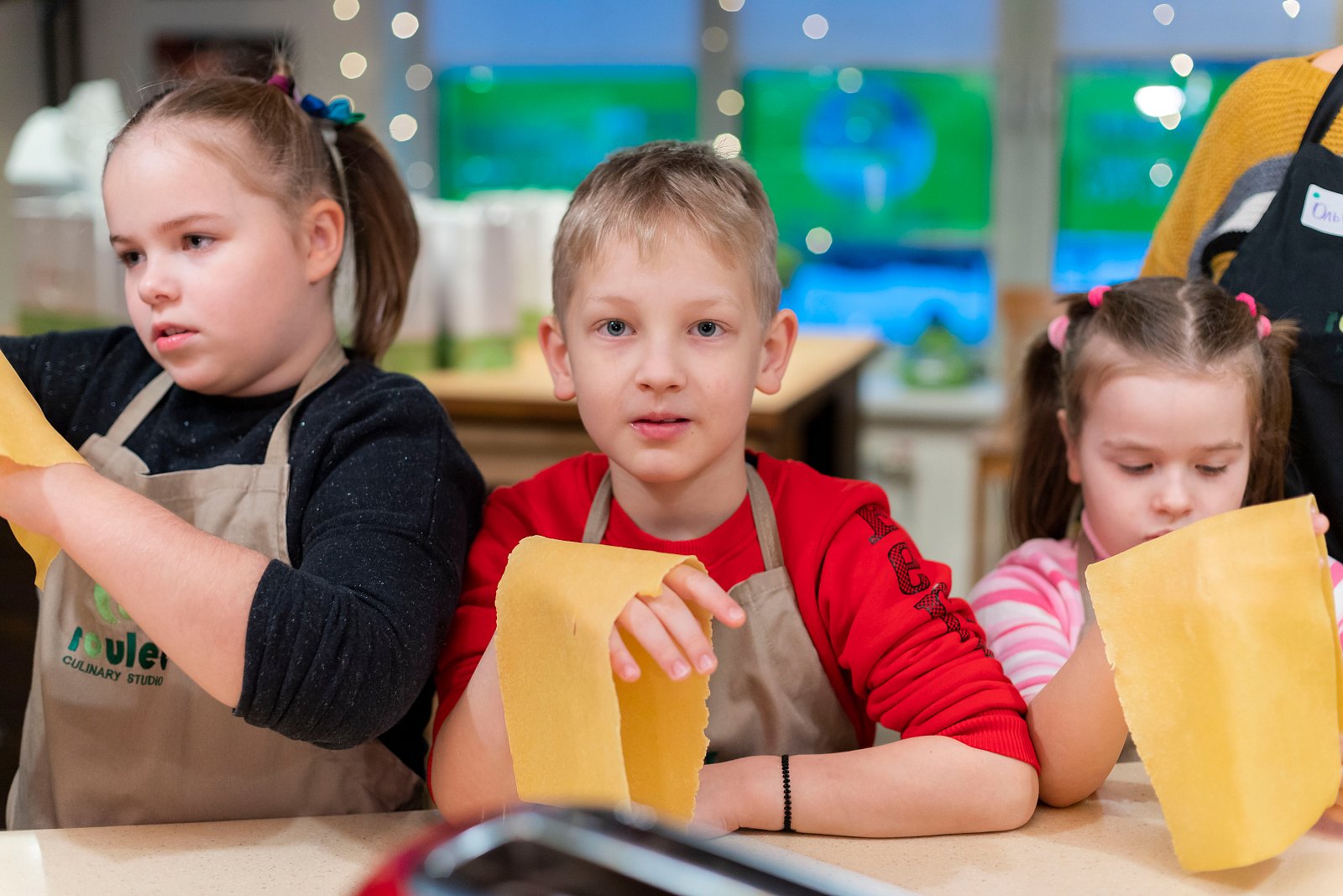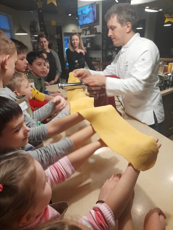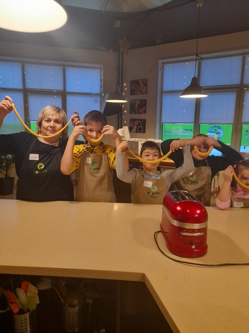 Ребята самостоятельно замешивали тесто, раскатали его на специальной машинке и в итоге получили длинное и тонкое тесто для спагетти.