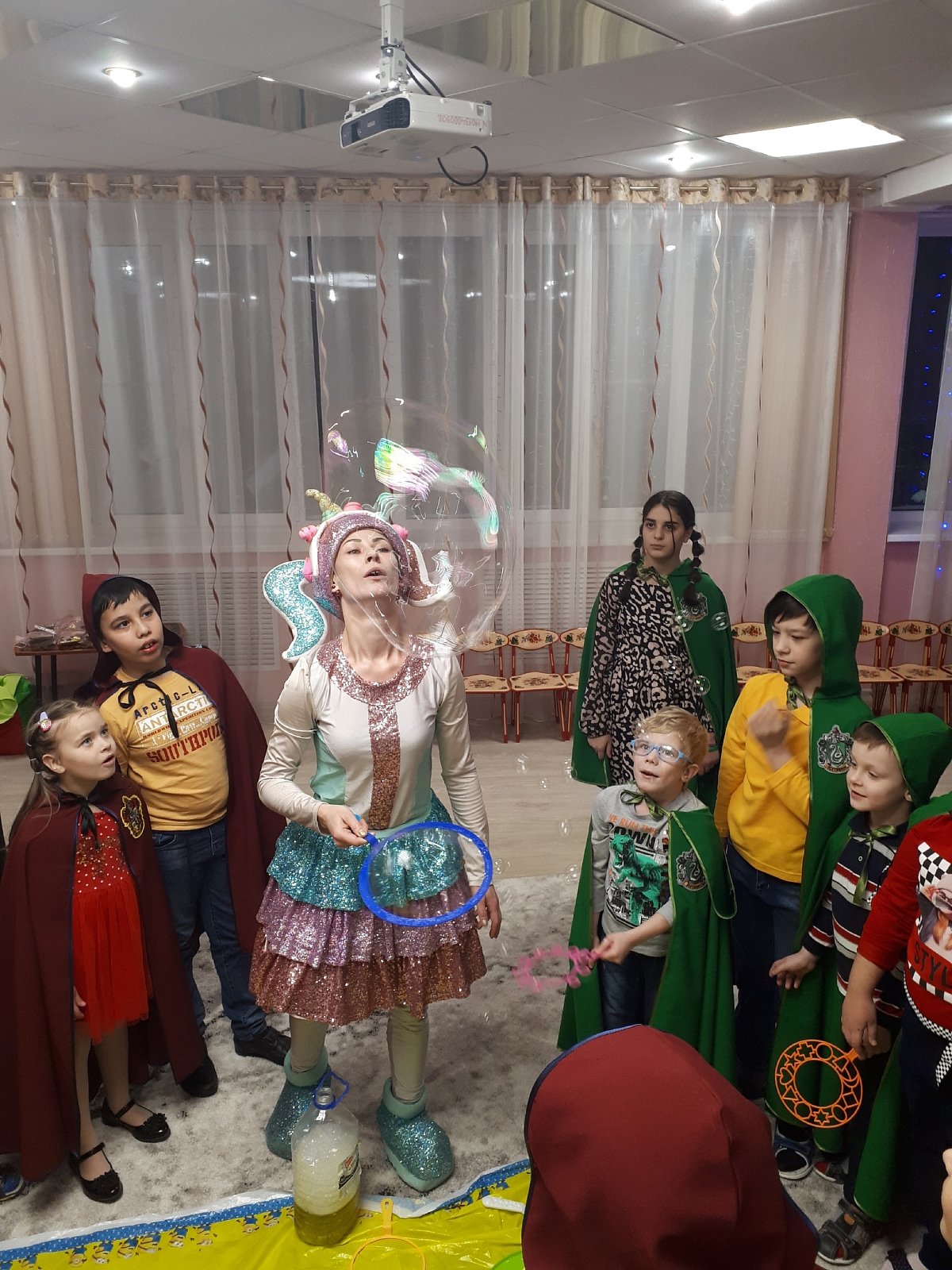 Детям нравится все загадочное и непостижимое! Магия, драконы, волшебные существа, приведения, страшилки. Этим вечером ребята окунулись в фантастический мир Гарри Поттера! Превратились в юных волшебников и смогли познать все тайны волшебного мира, в котором так давно хотели очутиться....Также ребята смогли поучаствовать в увлекательном шоу мыльных пузырей и фокусов.