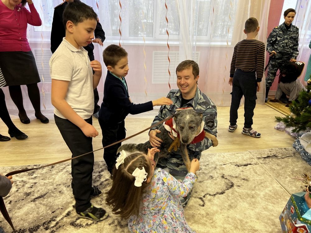 А еще полицейские приготовили сюрприз – привезли своих четвероногих напарников. Служебные собаки, одетые в новогодние костюмы, вызвали настоящий восторг у детишек..