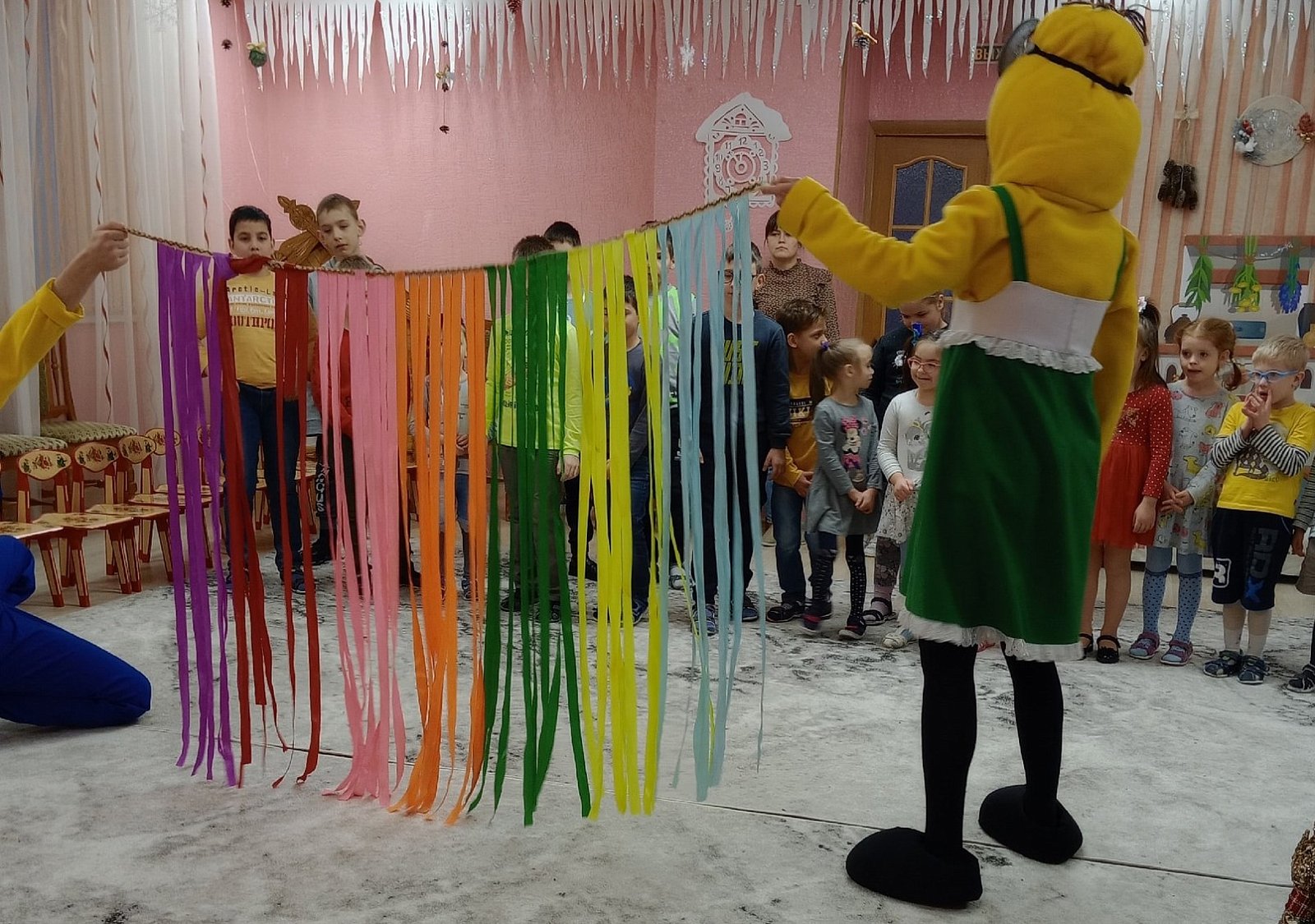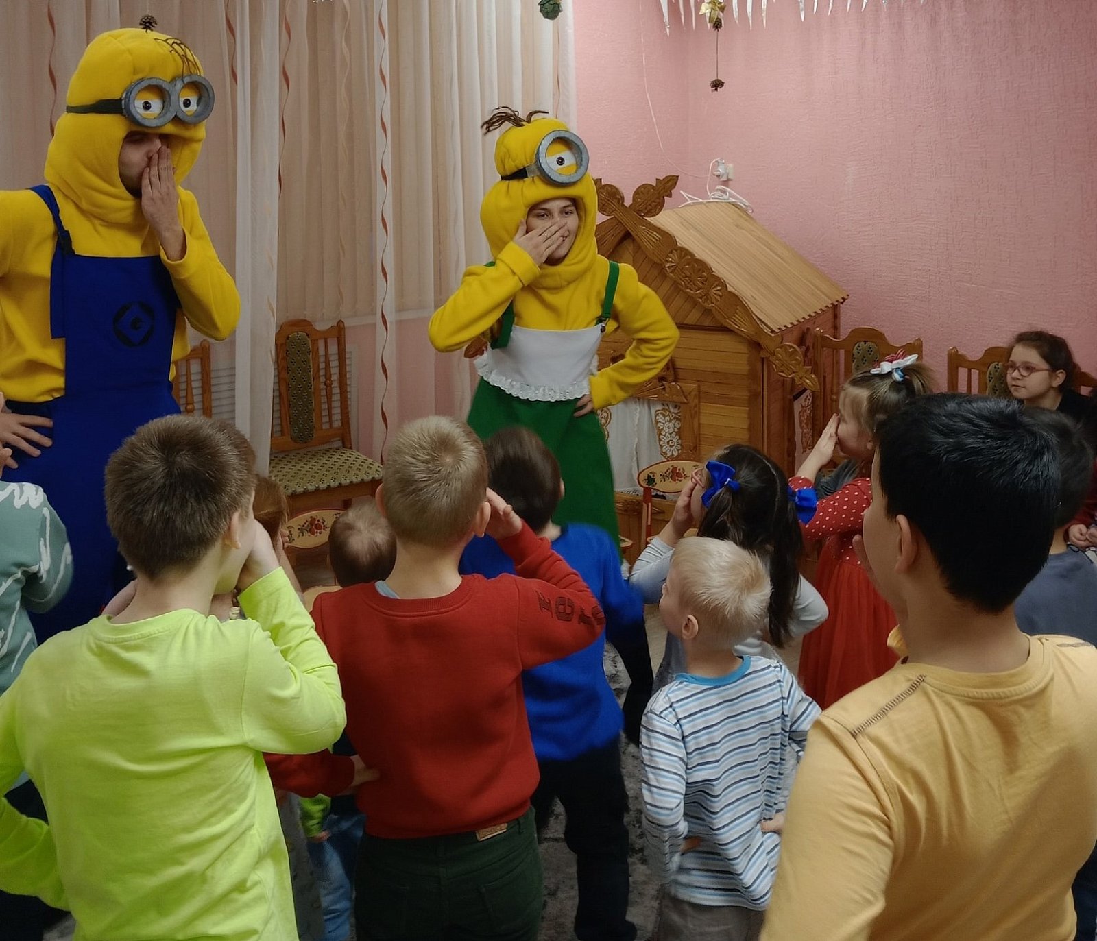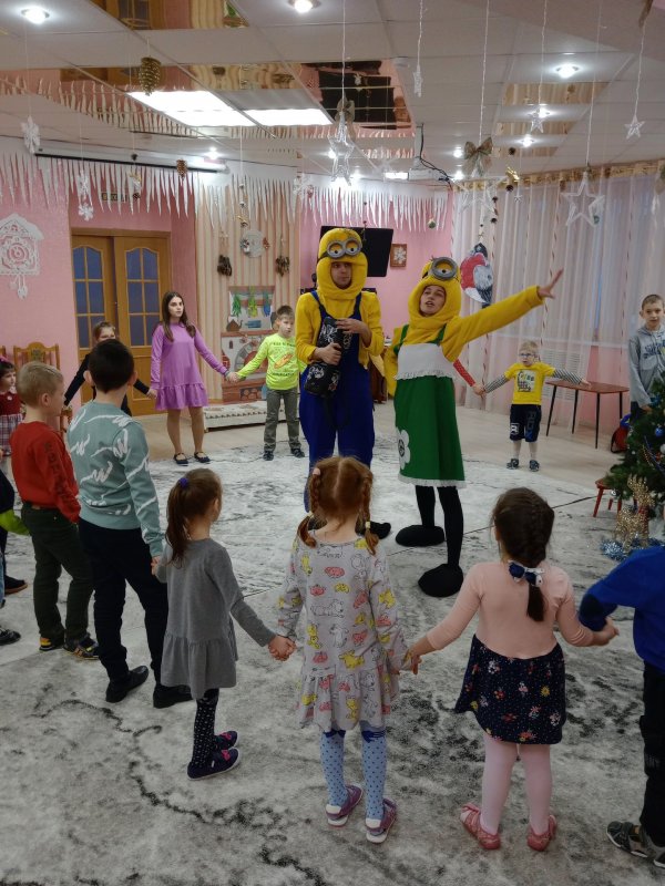 Поздравление наших ребят начался с неожиданного визита героев из мультфильма "Миньоны", которые отвлекли детей от школьных забот. Ребята пели песни, играли в подвижные игры, танцевали и придумывали новые танцевальные движения.