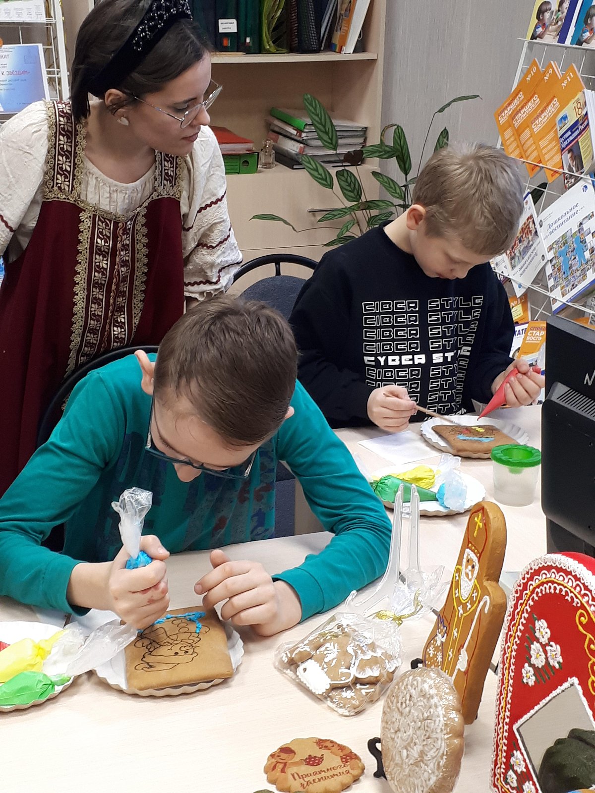 Во время мастер-класса ребята узнали об истории пряников, видах и их назначении, традиционных формах, о секретах пряничного теста и их украшении. Дети с интересом и удивлением рассматривали готовые работы мастера, а также ароматные специи и инструменты для изготовления пряников. Узнали что для росписи используются специальные пищевые краски (которые можно есть без вреда для здоровья)..Конечно, всем ребятам очень хотелось попробовать на вкус чудесную яркую глазурь….