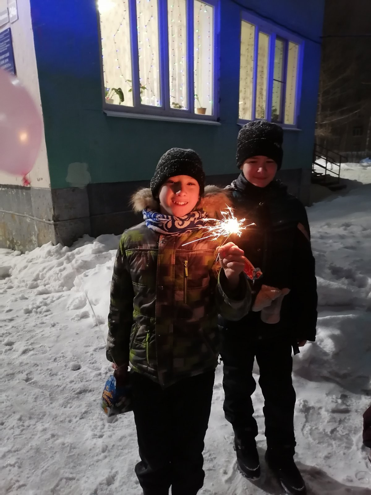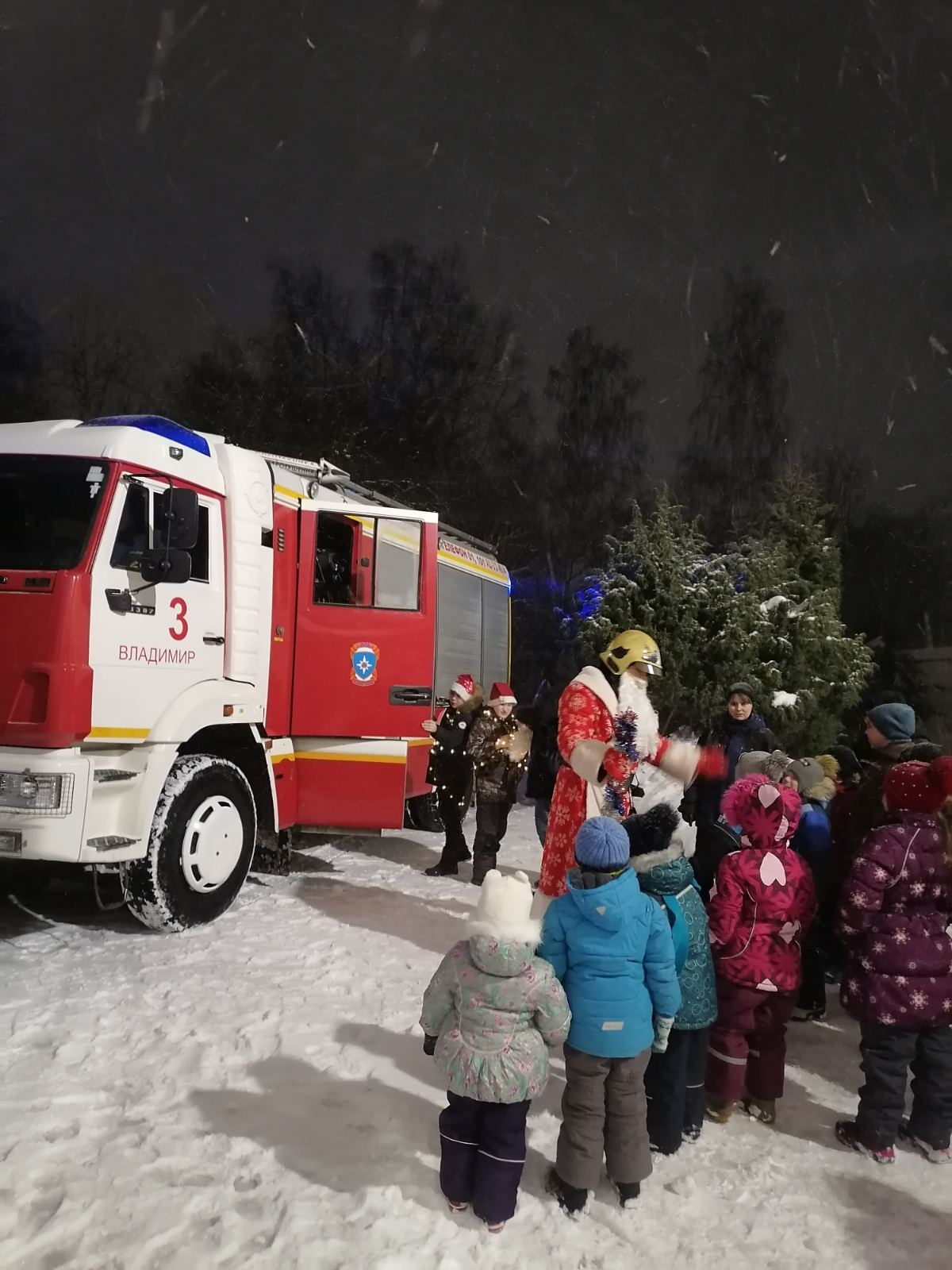 Дед Мороз и Снегурочка вручали сладкие подарки всем ребятам. Каждый рассказал стихотворения пожарному Деду Морозу, а потом вместе с ним спели новогоднюю песенку вокруг елки на улице. Ну и конечно, как без фейерверков. Это было фантастически красиво и незабываемо.