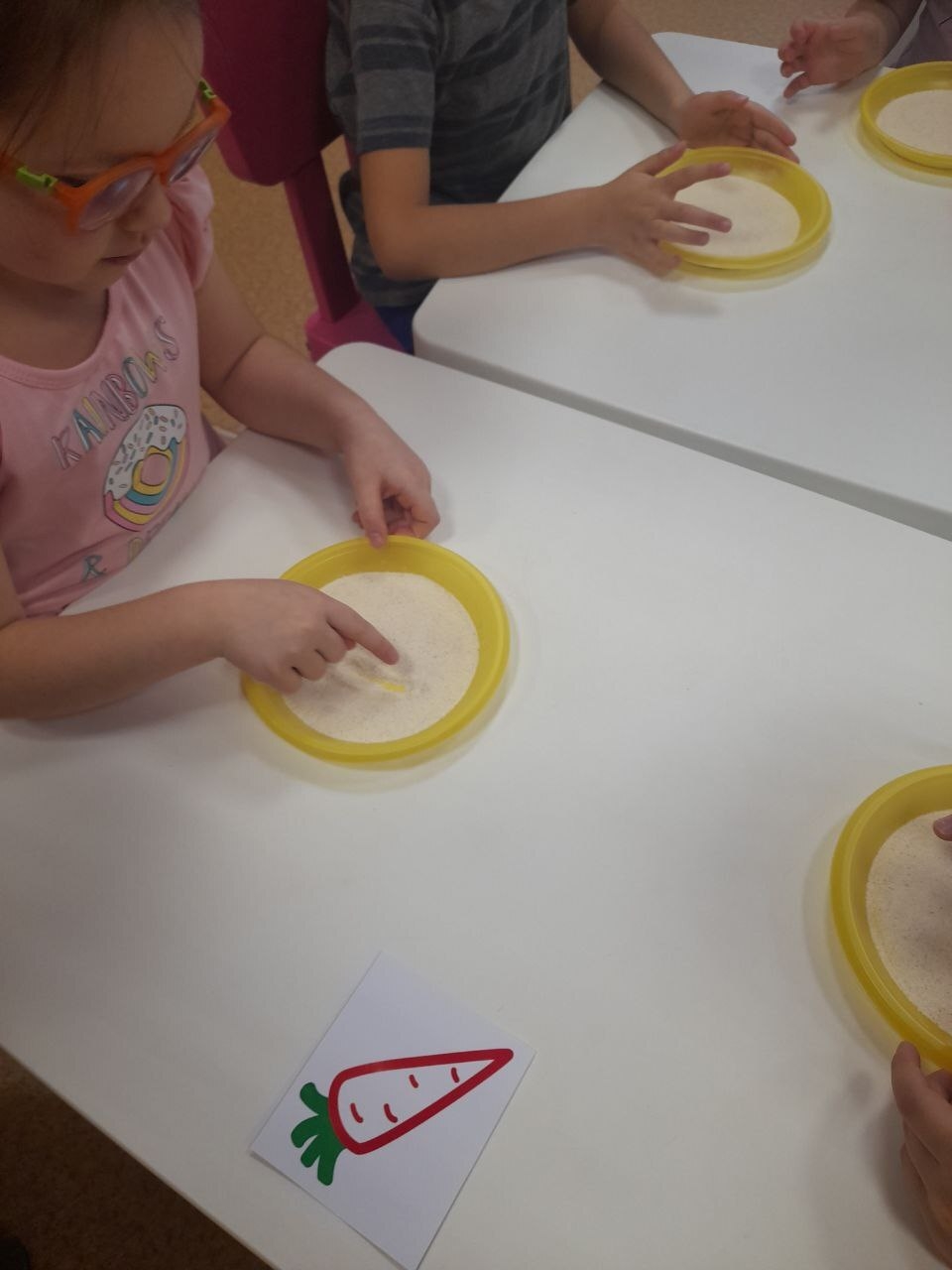 Дети с восторгом и интересом выкапывали картошку из кинестетического песка, погружаясь в увлекательную игру, развивая мелкую моторику. Также мы устроили веселую дегустацию: ребята угадывали на вкус разные овощи и фрукты! А какое же удовольствие приносило рисование на манке – все талантливо и креативно!