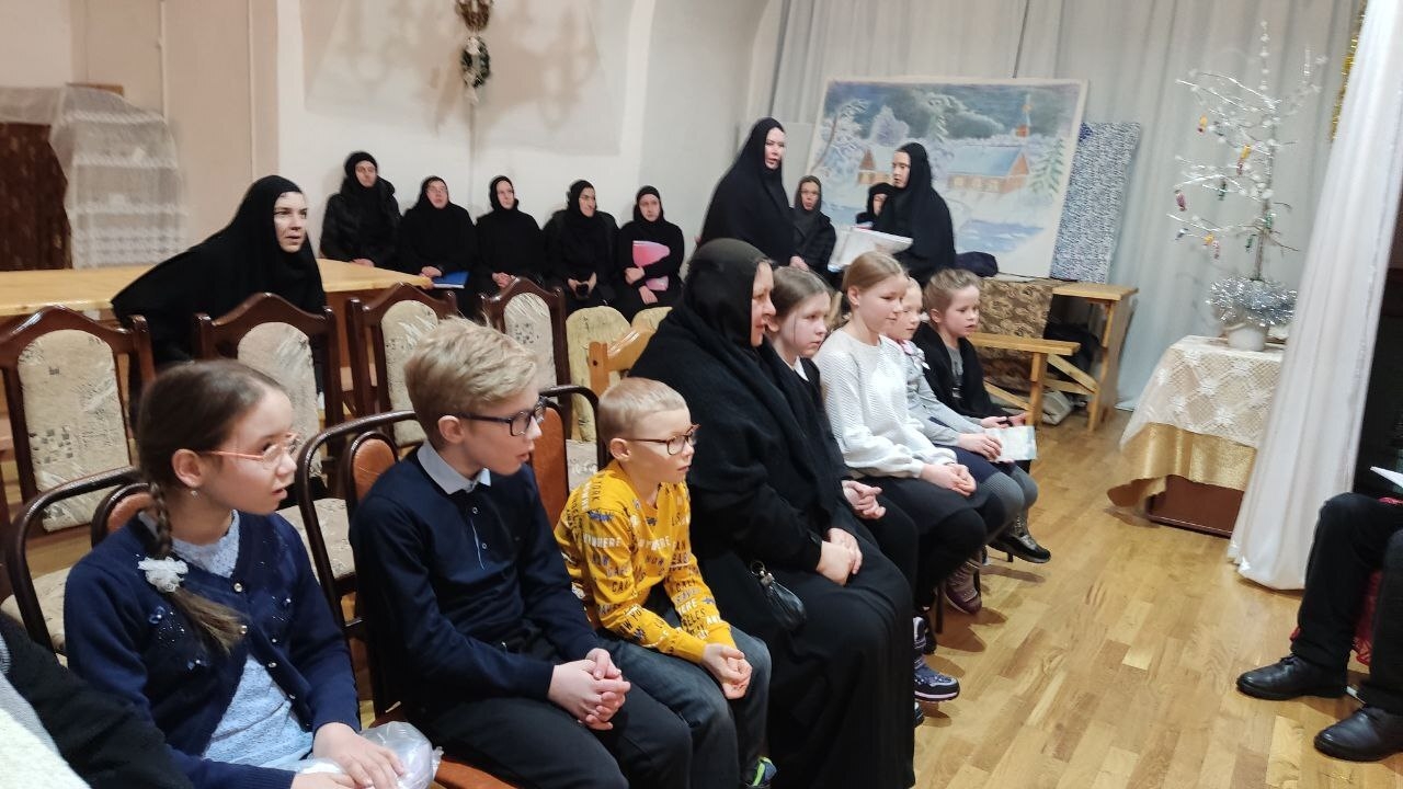 Сестры с любовью встретили наших ребят, провели экскурсию по храму, позвонили с ними на малой звоннице на колокольне. Воспитанники монастырской воскресной школы выступили с поучительной инсценировкой и песнями. Потом все вместе попили чай с угощениями, послушали рождественские колядки в исполнении сестер. Также наши ребята побывали на коровнике. Ребята с удовольствием гладили коровок и телят и фотографировались на память.