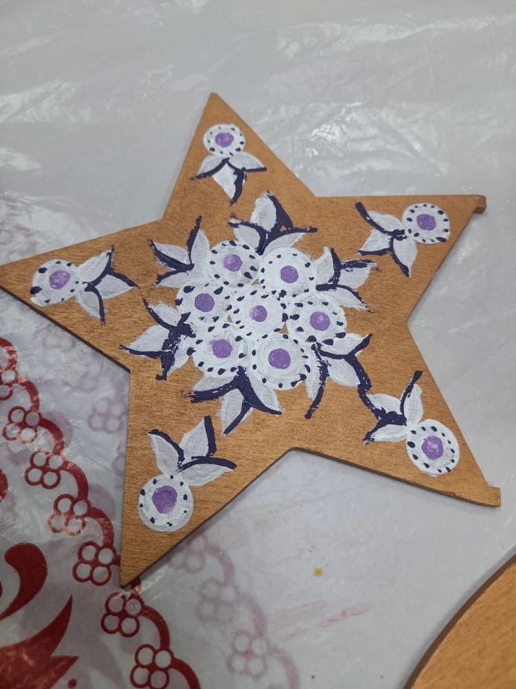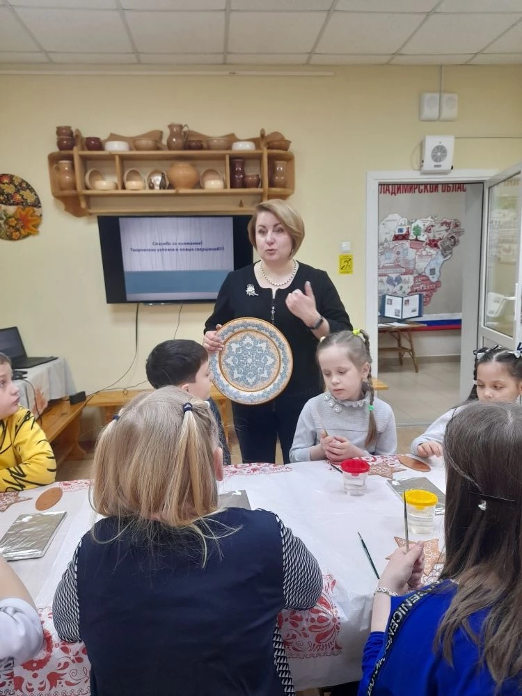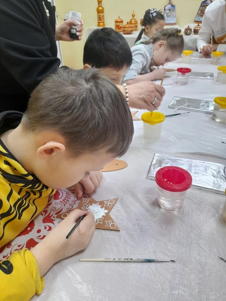 Но самое волшебное ждало впереди. Вместе с замечательным мастером дети взяли в руки кисти и расписали настоящие звёзды в технике тумановской росписи!