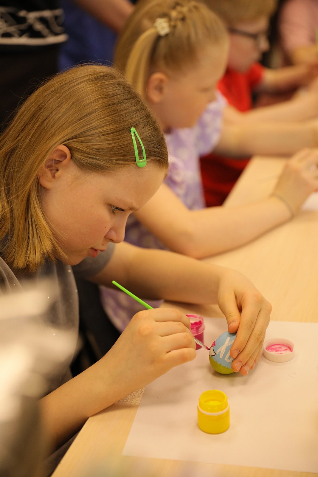 Затем началось самое творчество. Вместо привычных красок матушки привезли заготовки — деревянные яйца. Ребята с увлечением взялись за кисти. Под чутким руководством старших наставниц на белых деревянных боках расцветали яркие узоры: традиционные пасхальные орнаменты (кресты, веточки вербы, цветы), а также современные фантазийные сюжеты.