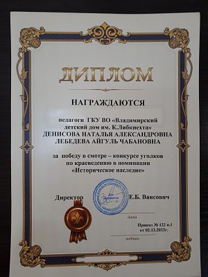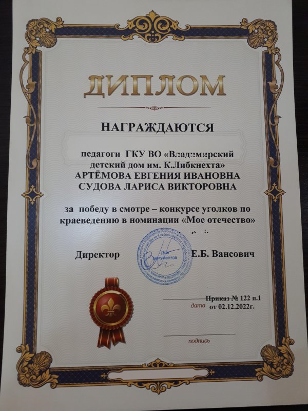Диплом за победу в смотре - конкурсе уголков по краеведению в номинации "Мое отечество".
