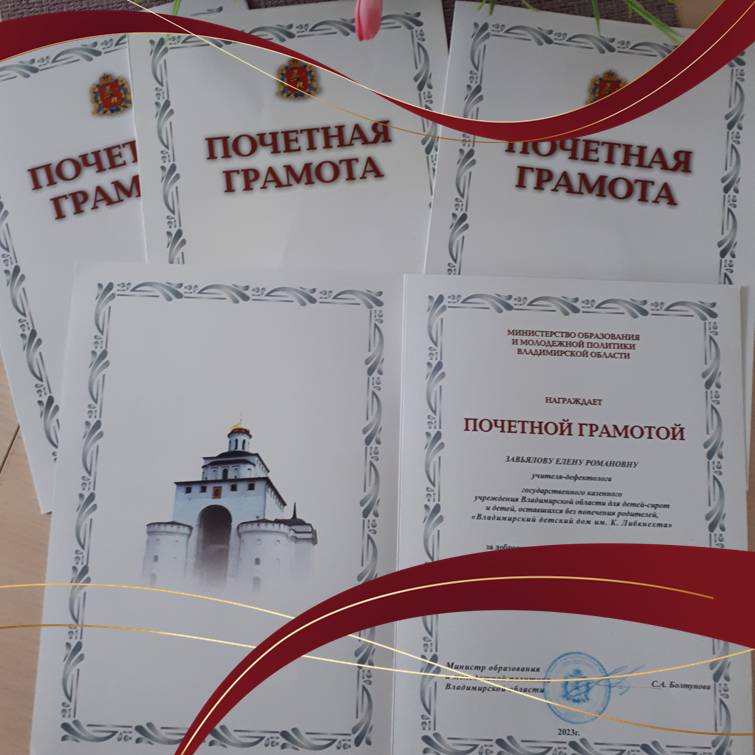 Педагоги Клюшникова Е.А., Завьялова Е.Р, Судова Л.В. награждены ПОЧЕТНОЙ ГРАМОТОЙ Министерством образовании и молодежной политики Владимирской области за значительные успехи в организации и совершенствовании учебного и воспитательного процессов, формирование интеллектуального, культурного и нравственного развития личности, большой личный вклад в практическую подготовку учащихся и воспитанников.